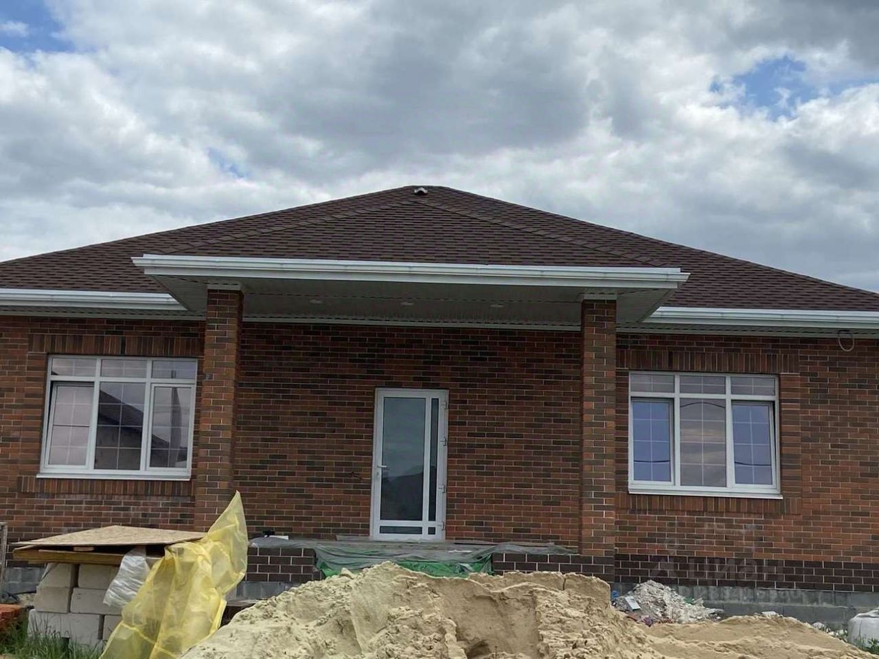 • фундамент- ленточно-свайный, армопояс • стены- блок Аэробел+утеплитель+облицовочный кирпич • крыша-мягкая кровля (утеплена) • водосточная система по периметру дома
