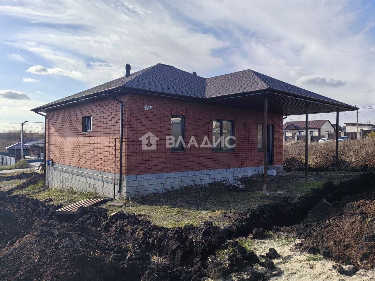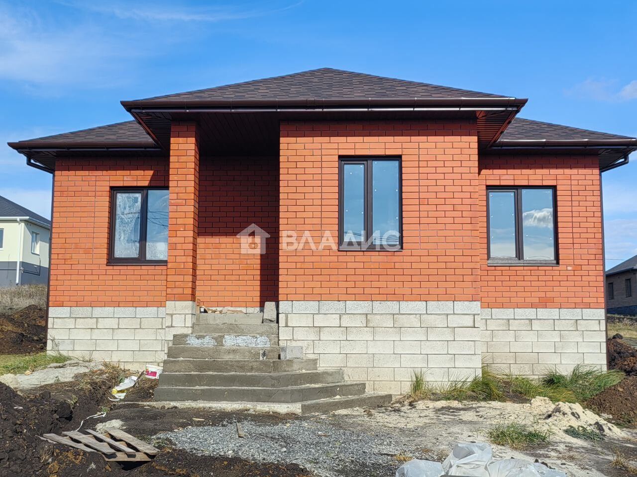 Дом построен в 2025 году из блочного материала, имеет две спальни, общая площадь составляет 82 кв. м, жилая — 60 кв. м, площадь кухни — 18,2 кв. м. Комнаты имеют площадь по 20 кв. м каждая, предусмотрены два совмещённых санузла. Участок площадью 12 соток имеет статус индивидуального жилищного строительства, подъезд к участку асфальтированный.