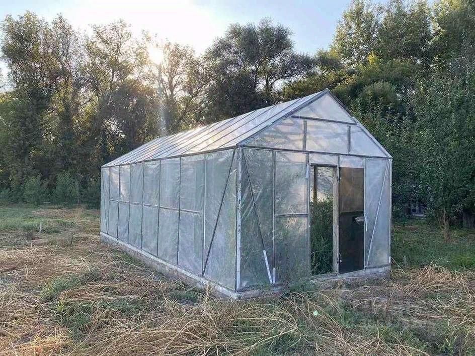 Установлена теплица с пленкой Светлица. Во дворе плодоносящий сад и мангальная зона в тени под кронами деревьев.