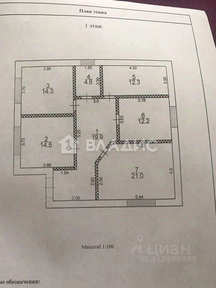 Площадь: общая — 98,8 кв. м, жилая — 47,7 кв. м, площадь кухни — 14,3 кв. м. В доме три комнаты: 14,5, 12,2 и 21 кв. м соответственно. Все комнаты изолированные. Высота потолков — 3 метра.