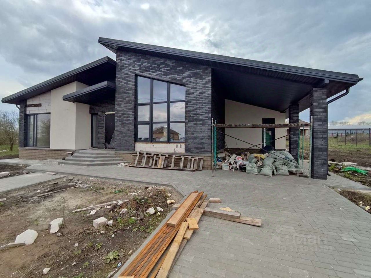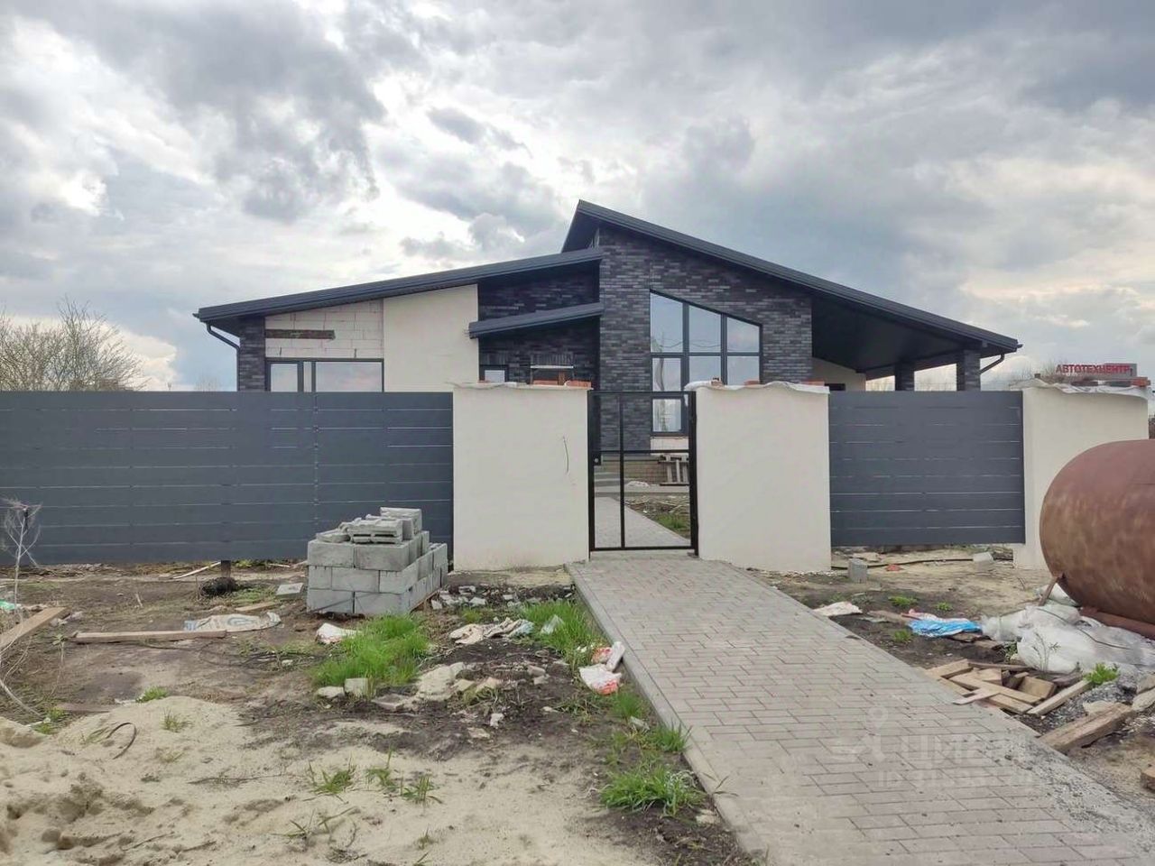 Спальни 3, кухня-гостиная с выходом на террасу, терраса, сан-узла 2, гардеробная, котельная, просторный хол, навес для машины, хоз-блок, забор, тротуарная плитка.