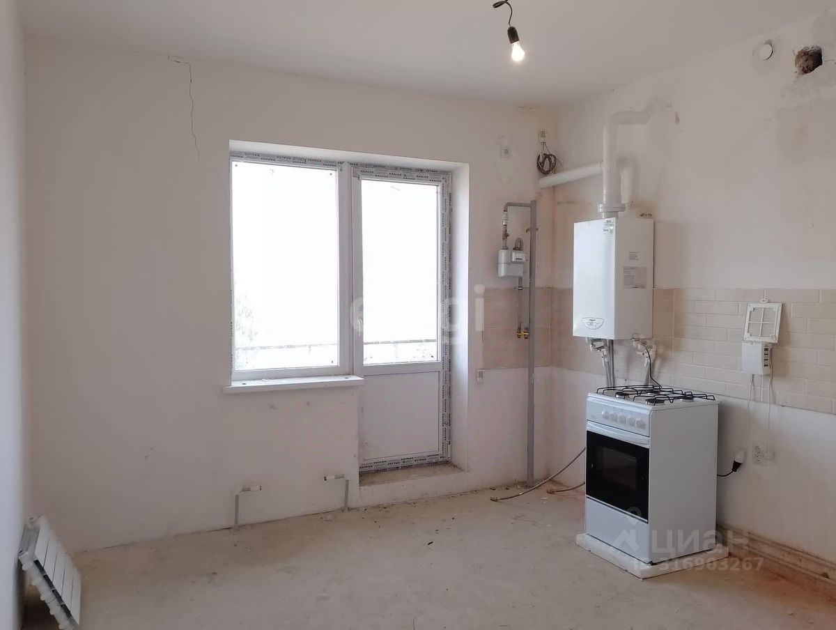 Кухня 15 кв.м. с балконом. Ванная комната в плитке, сантехника установлена. Пол линолеум, окна пластиковые, металлическая дверь.
