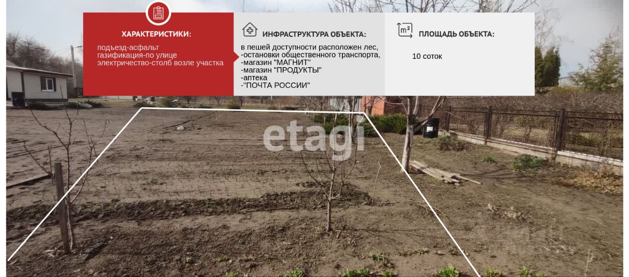 ПРОДАЕТСЯ ЗЕМЕЛЬНЫЙ УЧАСТОК 10 соток расположенный в экологически чистом месте в 10 минутах езды от города, в селе Лапыгино. ИНФРАСТРУКТУРА: в пешей доступности расположен лес, -остановки общественного транспорта, -магазин ''МАГНИТ'' -магазин ''ПРОДУКТЫ'' -аптека -''ПОЧТА РОССИИ'' Подъезд к участку осуществляется по асфальтированной дороге, поэтому у вас не возникнет проблем с транспортной доступностью. Участок имеет ровную, прямоугольную форму, что позволяет грамотно расположить будущее строение. Это прекрасный участок для тех, кто хочет построить дом своей мечты в живописном и спокойном месте, находясь при этом недалеко от города. Участок разработан, на участке имеются 2 больших теплицы из поликарбоната, насаждения плодовых деревьев и кустарников. Компания ''ЭТАЖИ'' работает только с аккредитованными застройщиками, которые помогут спроектировать дом Вашей мечты!