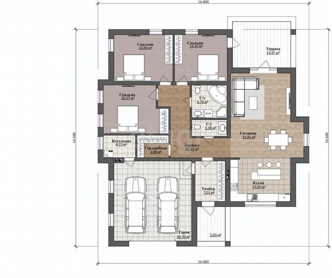 В доме : кухня-гостиная с выходом на террасу , 2 санузла , 3 спальных комнаты , гардеробная, котельная,гараж на 2 автомобиля . Планировка очень удобная (план на последнем фото)!