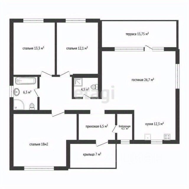 Планировка дома продумана до мелочей - максимально удобная и комфортная для жизни семьи. На входе в дом навес над крыльцом. Прихожая 6,5 м2 с нишей под систему хранения, бойлерная 4,5 м2. Шикарная, светлая и просторная гостиная 26,7 м2 с панорамными окнами и выходом на просторную террасу. Отдельно выделенная кухонная зона 12м2. Три спальни: 18 м2 с нишей под шкаф и две детские спальни 13,3 и 12,1м2, два санузла. Окна ПВХ тройной стеклопакет с темной ламинацией с фасада дома.