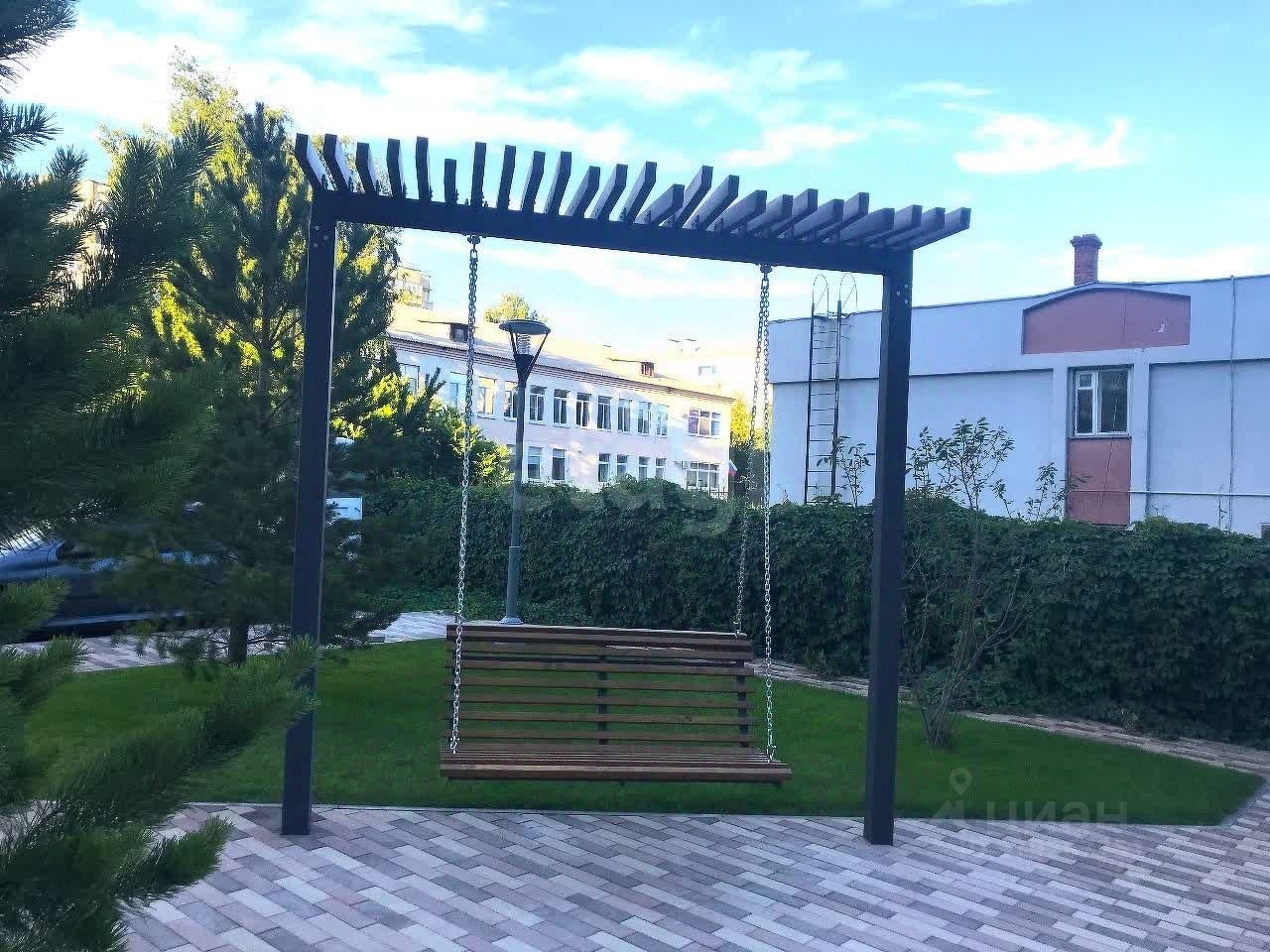 Уютный, закрытый от посторонних двор, включает в себя детскую площадку, небольшую зону для занятия спортом и фитнесом, скамейки для отдыха, элементы озеленения.