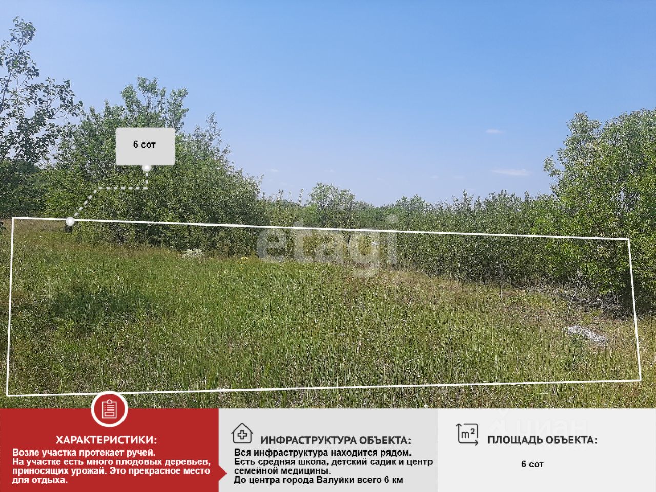 В этом районе проходит автомобильная трасса и маршрут 1 городского транспорта. До центра города Валуйки всего 6 км. Возле участка протекает ручей. На участке есть много плодовых деревьев, приносящих урожай. Это прекрасное место для отдыха.