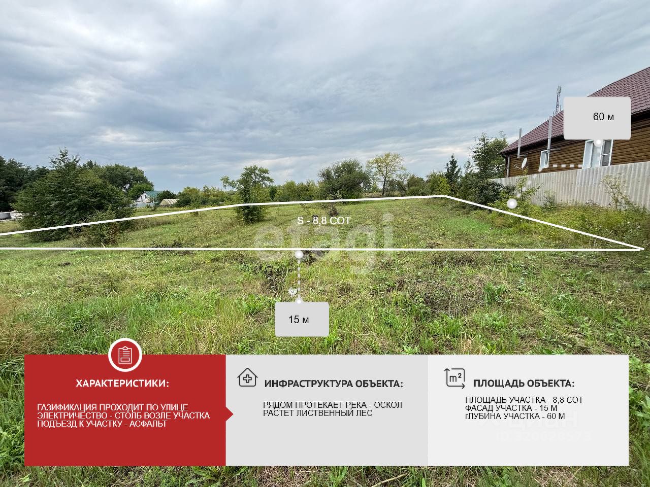 Общая площадь: 8,8 соток Размеры участка: длина фасада — 15 метров, глубина — 60 метров Коммуникации: Асфальтовая дорога обеспечивает удобный подъезд Столб электроснабжения рядом с участком Газопровод проходит вдоль улицы Возможность пробурить собственную скважину