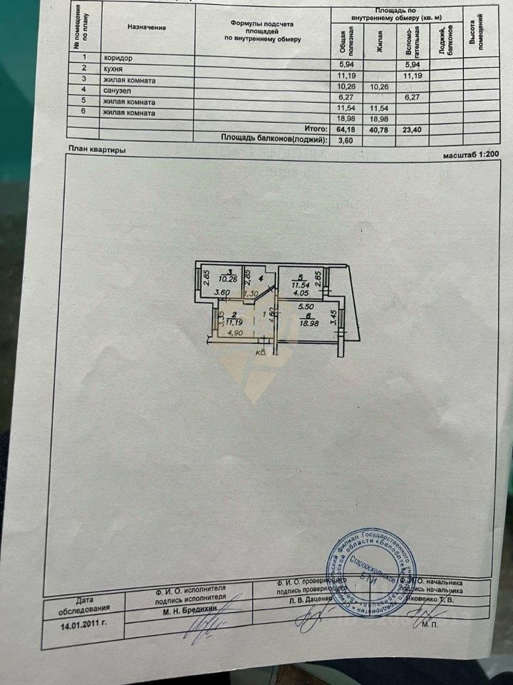 Общая площадь 64,18 кв.м, Жилая - 40,78 кв.м, Площадь комнат 18,98, 11,54, 10,26 кв.м, Кухня 11,19 кв.м.