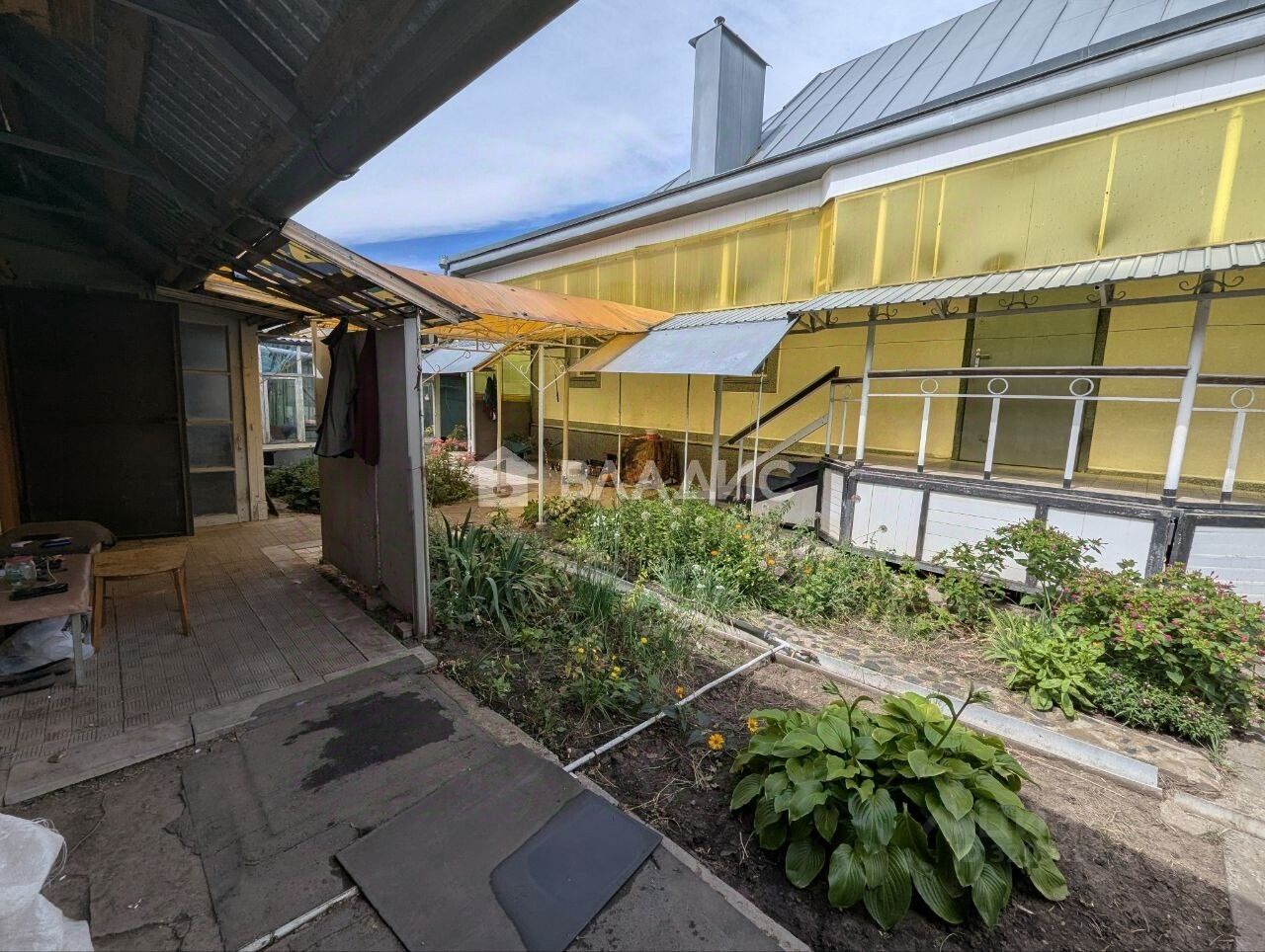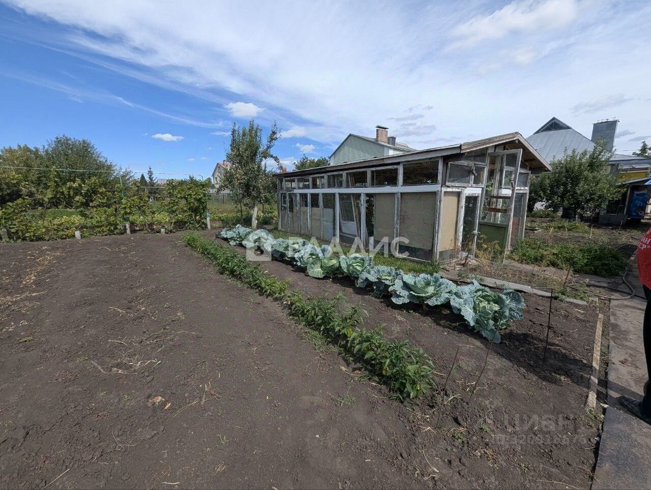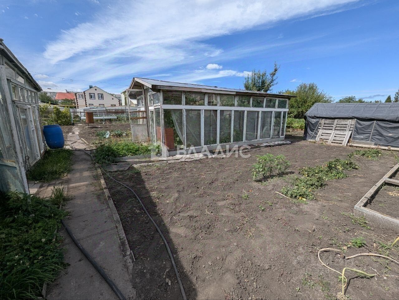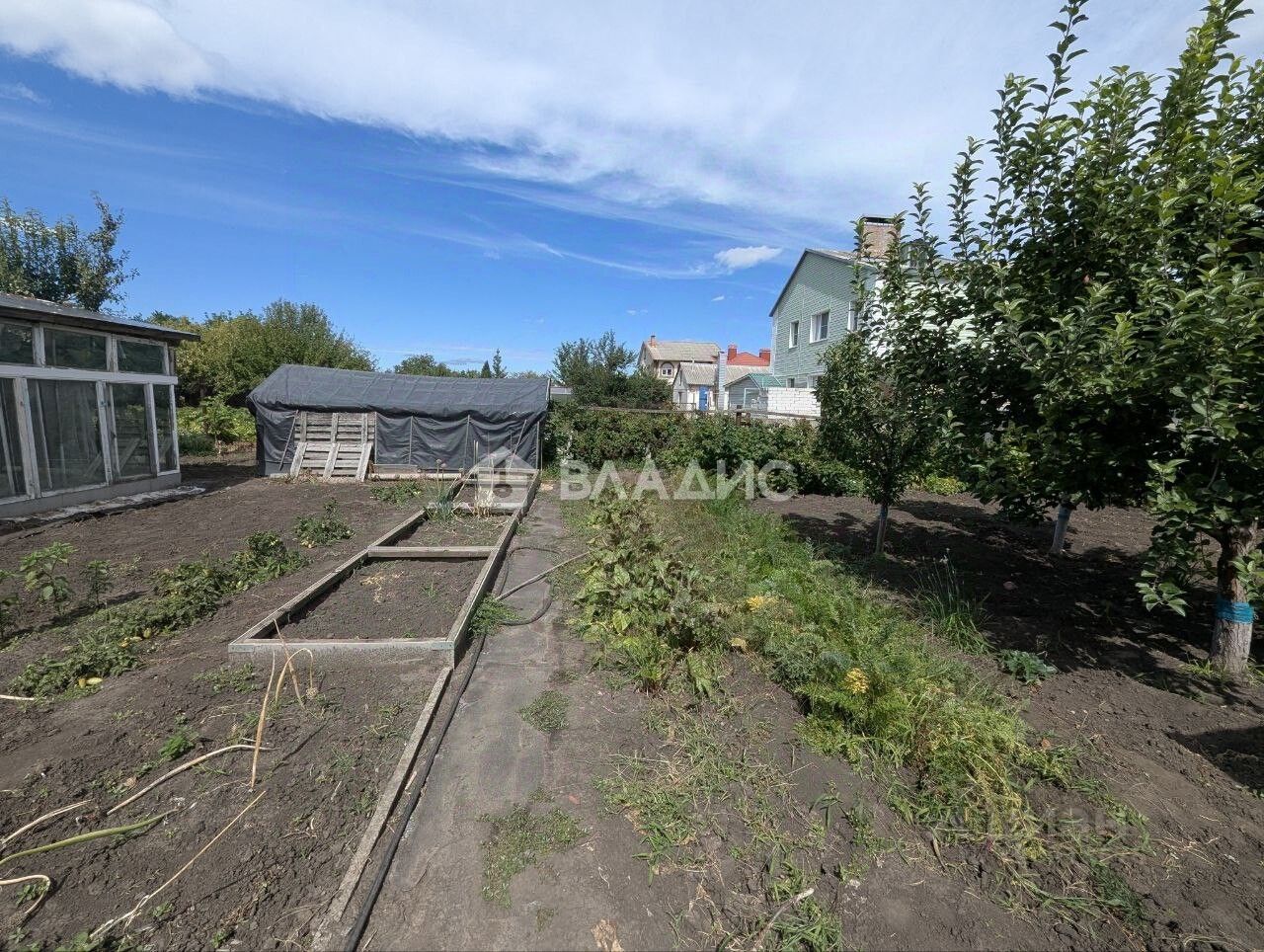 Участок огорожен от соседей, есть несколько теплиц, подведена вода для полива. Земля- чернозем. Много плодовых деревьев, малина, крыжовник.