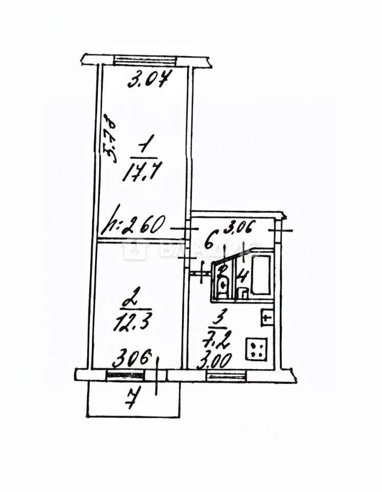 Общая площадь: 44 кв. м. Жилая площадь: 30 кв. м. Площадь кухни: 6 кв. м. Количество комнат: 2 (17,7 кв. м и 12,3 кв. м).