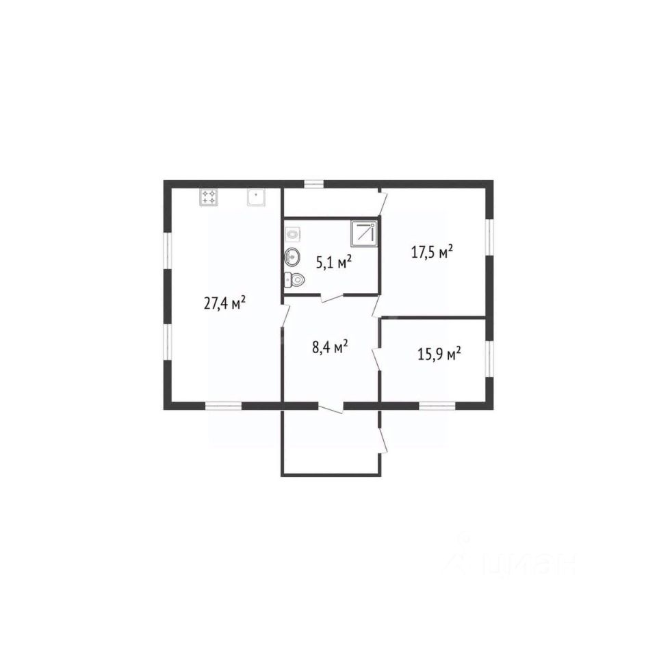 Планировка дома: две изолированные комнаты площадью 17,5 и 15,9 кв.м, просторная кухня-гостиная 27,4 кв.м, совмещенный санузел 5,1 кв.м. и функциональные подсобные помещения.