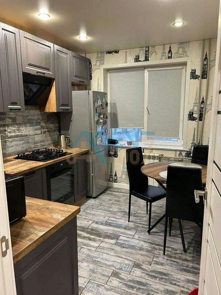 Современная кухня 9 м.кв, оборудованная техникой: холодильник, духовой шкаф, вытяжка и мебелью, которая так же останется будущим владельцам.