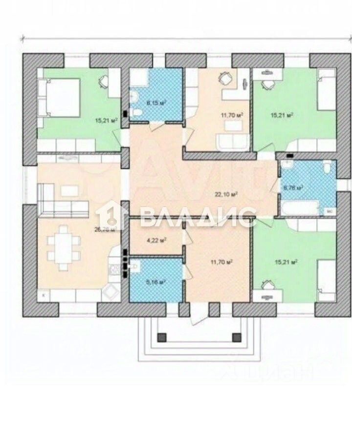 Общая площадь дома — 153 кв. м, 3 комнаты - 20+30+15кв.м. Кухня+гостинная — 35 кв.м. 2 с/узла - один совмещенный - 6кв.м., второй - 15 кв.м с котельной. Прихожая - 20кв.м. Терраса - 12кв.м.