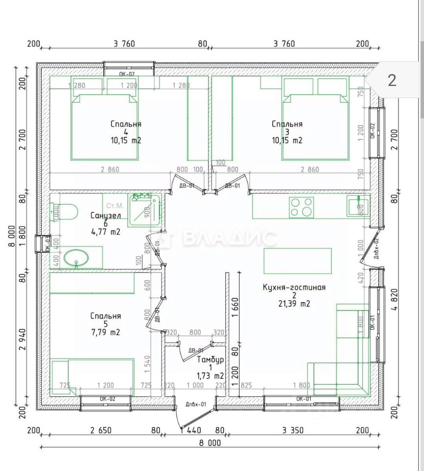 Дом имеет общую площадь 60 кв. м и включает три комнаты: две по 10,2 кв. м и одну 7,8 кв. м. Жилая площадь составляет 28,2 кв. м, а кухня — 21,4 кв. м. Высота потолков — 3 метра, что создаёт дополнительное ощущение простора.
