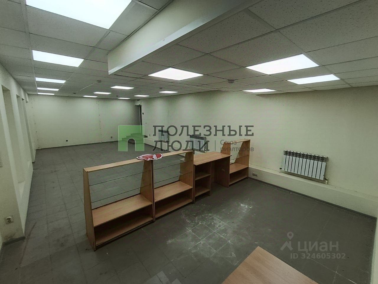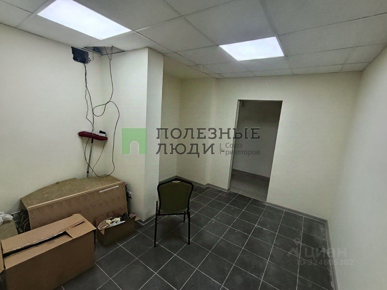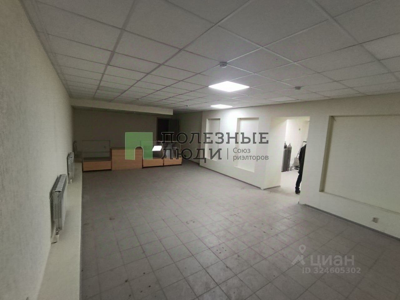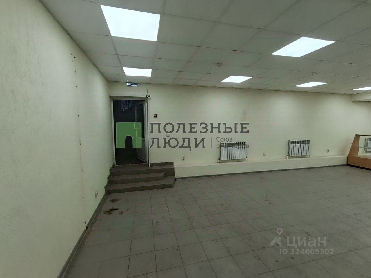 Офисная отделка, подвесные потолки со встроенными светильниками высотой 2,7 м. Стены покрашены, на полу плитка, радиаторы алюминиевые. пластиковая дверь.
