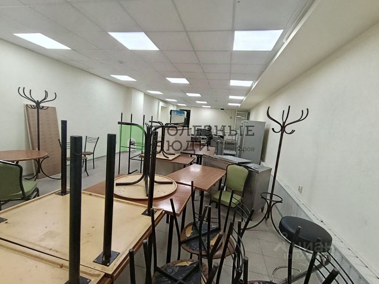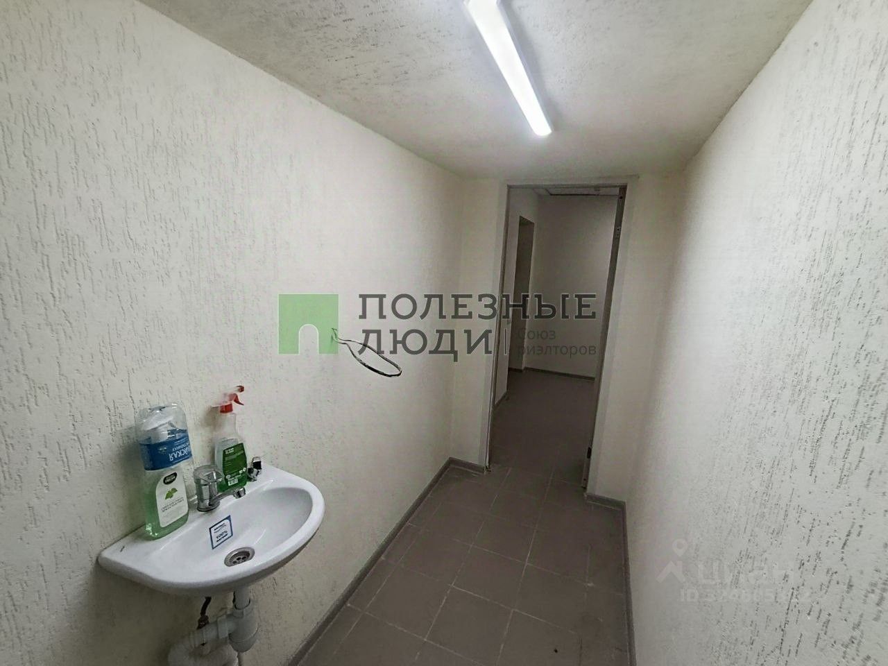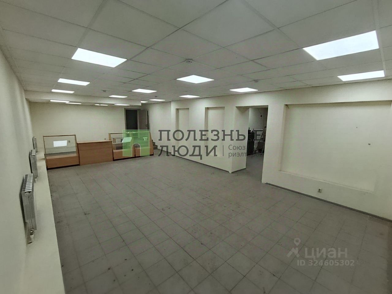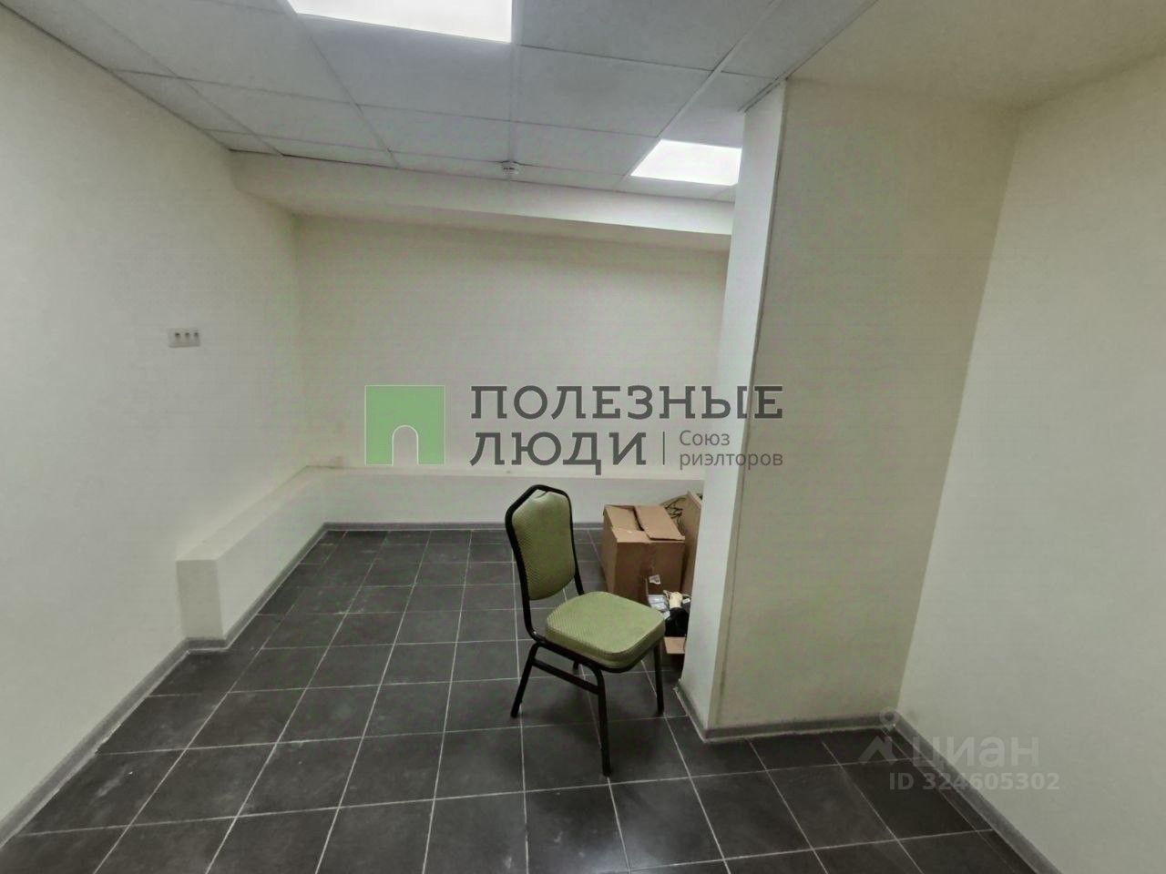 Офисная отделка, подвесные потолки со встроенными светильниками высотой 2,7 м. Стены покрашены, на полу плитка, радиаторы алюминиевые. пластиковая дверь.