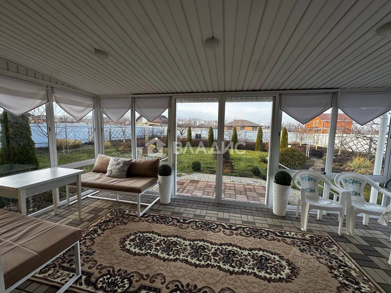Дом просторный: площадь основания — 143 кв. м, включая уютную остеклённую веранду (18 кв. м). По документам в ЕГРН указано 107,6 кв. м. Кроме самого дома, на участке есть тёплый гостевой домик (32 кв. м под застройку) и хозяйственный склад (5,2 кв. м) из металла, обшитый профлистом.