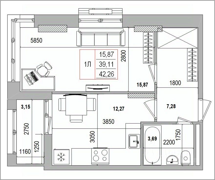 Общая площадь42,26 м2