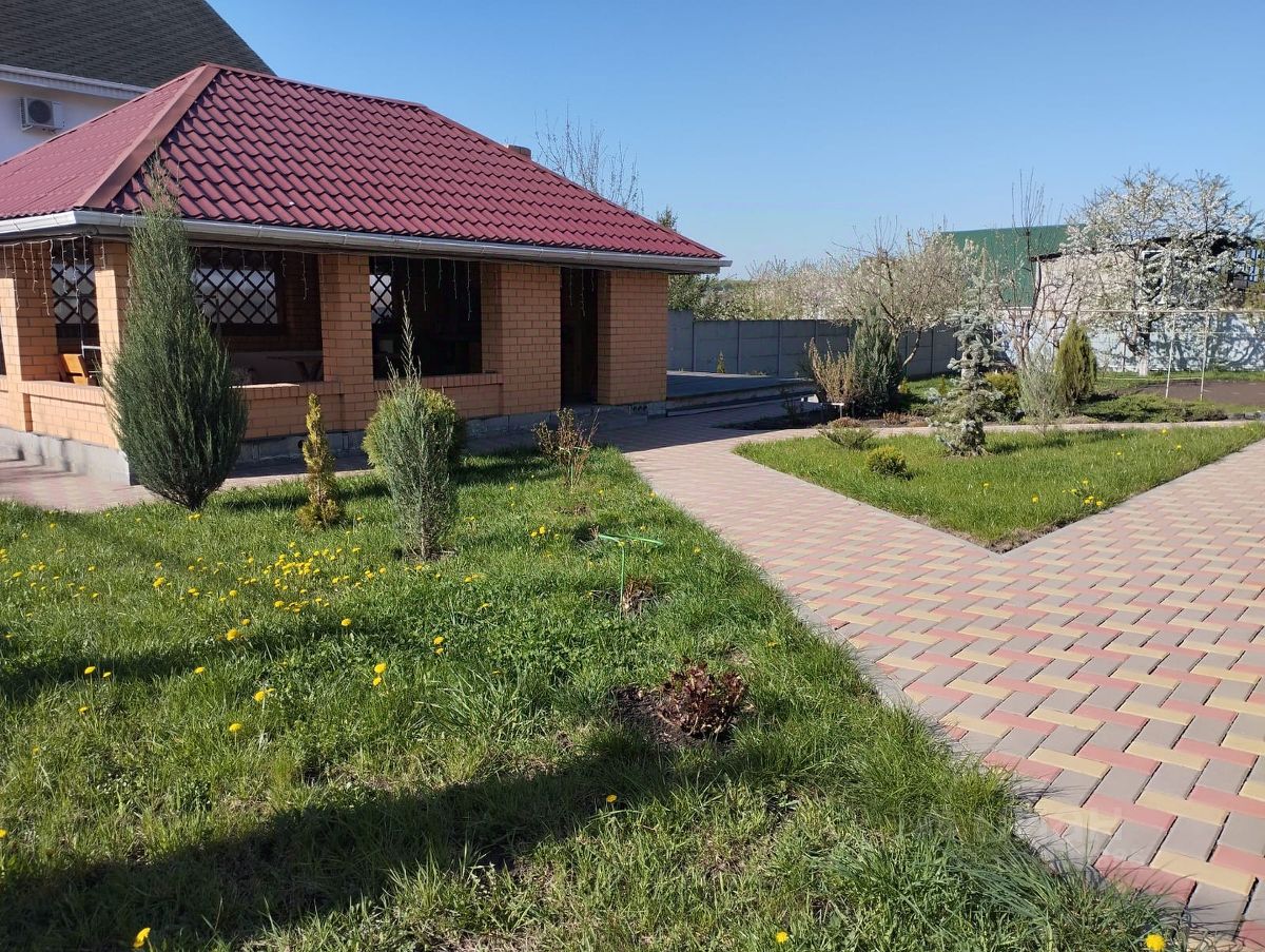 Просторный гараж оборудован смотровой ямой, если сами обслуживаете машину, а зимой не придется чистить машину от снега и обледенения. Близость района к городской черте, а также проживание в нем влиятельных граждан предусматривает быструю и постоянную чистку дорог от снега зимой. Участок облагорожен тротуарной плиткой с необходимыми площадками и дорожками. Территория двора благоустроена газонами, розами, туями и можжевельниками, которые создают по-настоящему наслаждение природной красотой и изяществом. В сочетании с просторной беседкой, большой террасой и зеленью создается единый ансамбль для отдыха, релакса и наполнения жизненной энергией вечерами, особенно весной и летом. В беседке мебель, подвал для хранения овощей, фруктов, вазонов для летних цветов, печь и очаг, где можно жарить шашлыки, кухонная зона с мойкой. Также рядом с террасой имеется оборудованная площадка под большой 5-м каркасный бассейн (в наличии), для которого предусмотрена самодельная система подогрева от солнца. Есть шезлонги и другая сезонная мебель для террасы, которая создаст уют и удобство при летних купаниях. Сад плодоносящий, обработан и включает в себя плодовые деревья — яблони, груши, черешню, персик, слива, вишни, абрикосы, шарафуга синяя и желтая. Весной всё цветёт, летом — свои фрукты и ягоды. Огород чистый, имеются несколько грядок клубники, виноградник, плодоносящие кусты голубики, йошты, черной смородины, черноплодной рябины. Оборудована большая емкость под сбор дождевой воды и обустройства капель