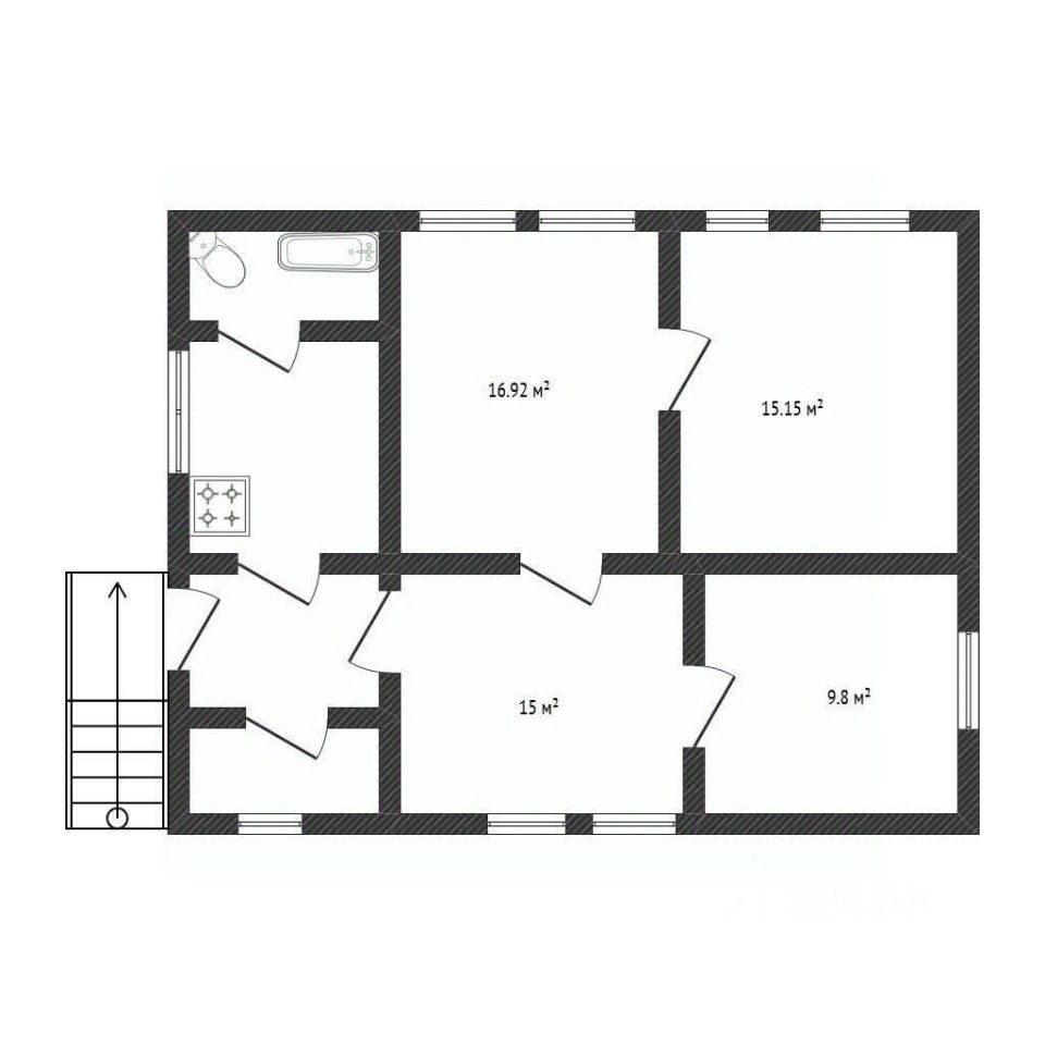 Дом теплый, с газовым отоплением и автономным водоснабжением от собственной скважины, дополненным электрическим бойлером. Планировка включает четыре комнаты: просторный зал, две спальни, холл, кухню и совмещенный санузел. Крыша выполнена из шифера.