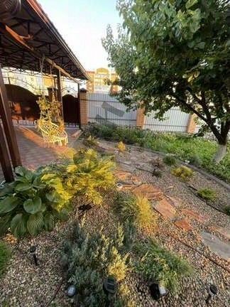 Во дворе выполнен красивый ландшафтный дизайн, куда вложено много средств, сил и любви. Много плодовых деревьев, ягодных кустарников (очень много ягод и фруктов): абрикос, грецкий орех, вишня, черешня, груша, яблони, слива, шелковица, алыча, ирга, жимолость, малина, клубника, ежевика, голубика, черника, брусника, смородина (черная, красная, белая).
