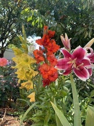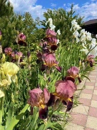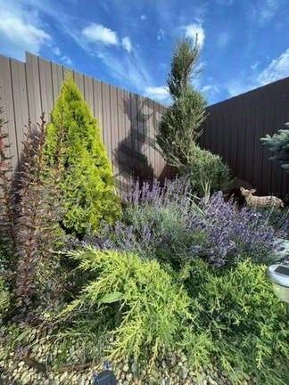 На участке много разных хвойников, декоративных злаковых и разных цветов, коллекция роз 50 сортов. Есть пряные травы: мята, мелисса, тимьян, шалфей, лаванда, розмарин, чабрец и др.