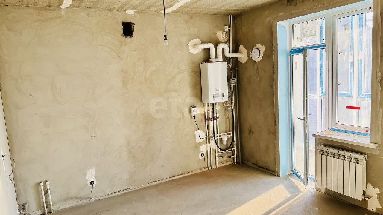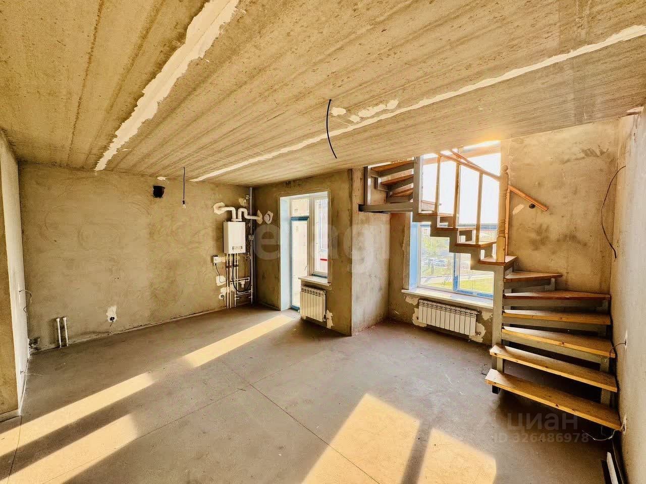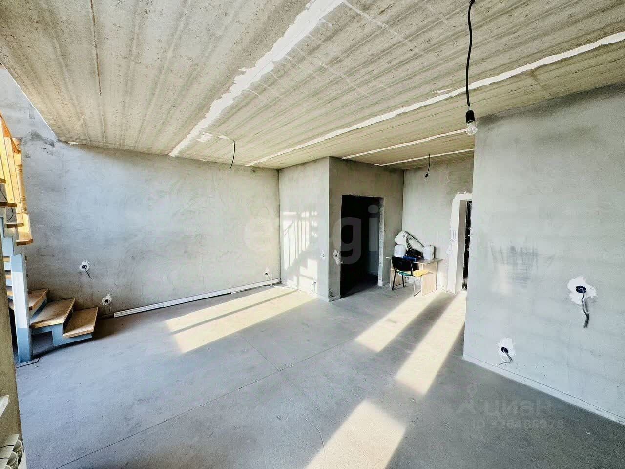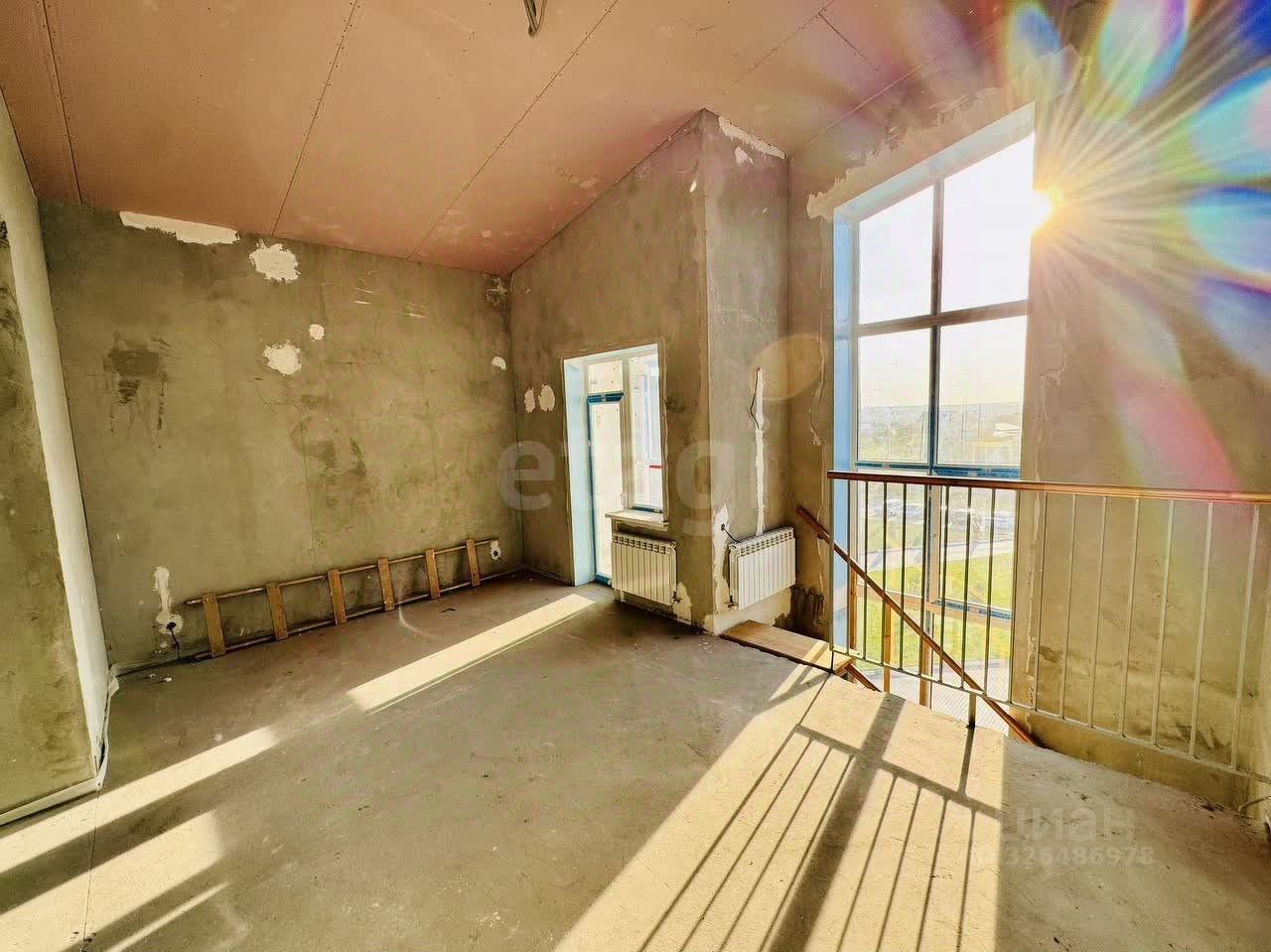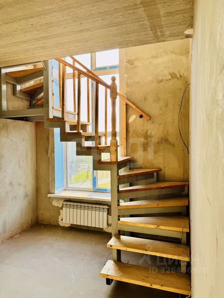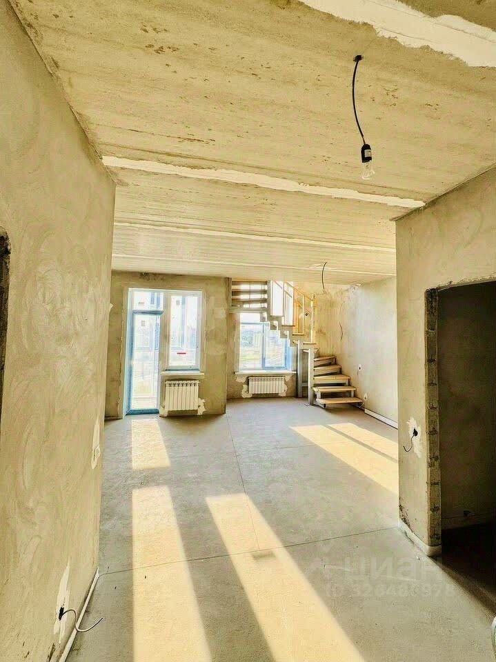 В квартире предчистовая отделка: стены выровнены и оштукатурены, выполнена разводка электрики, произведена разводка системы водоснабжения и канализации, установлены радиаторы, установлена лестница на косоурах ''от застройщика''.