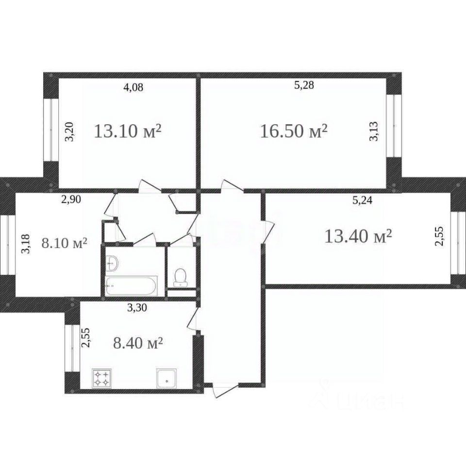 Комнаты - 11,9 м2, 13,1 м2, 12,6 м2 и 17,3 м2.
