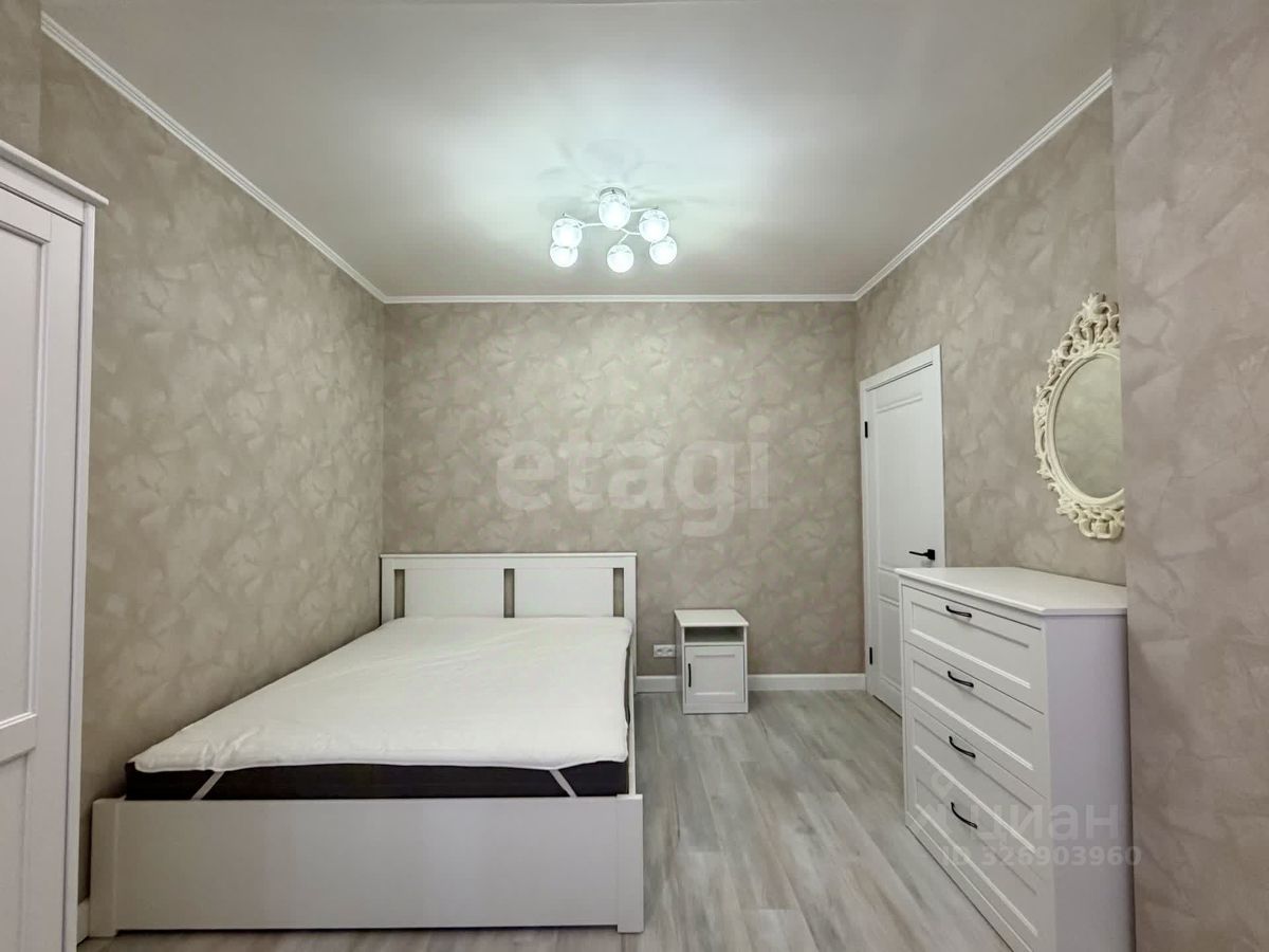 Изолированная спальня правильной формы в светлых тонах. Меблированная.