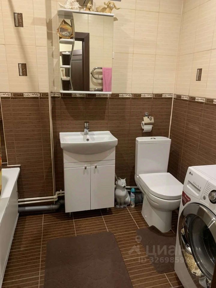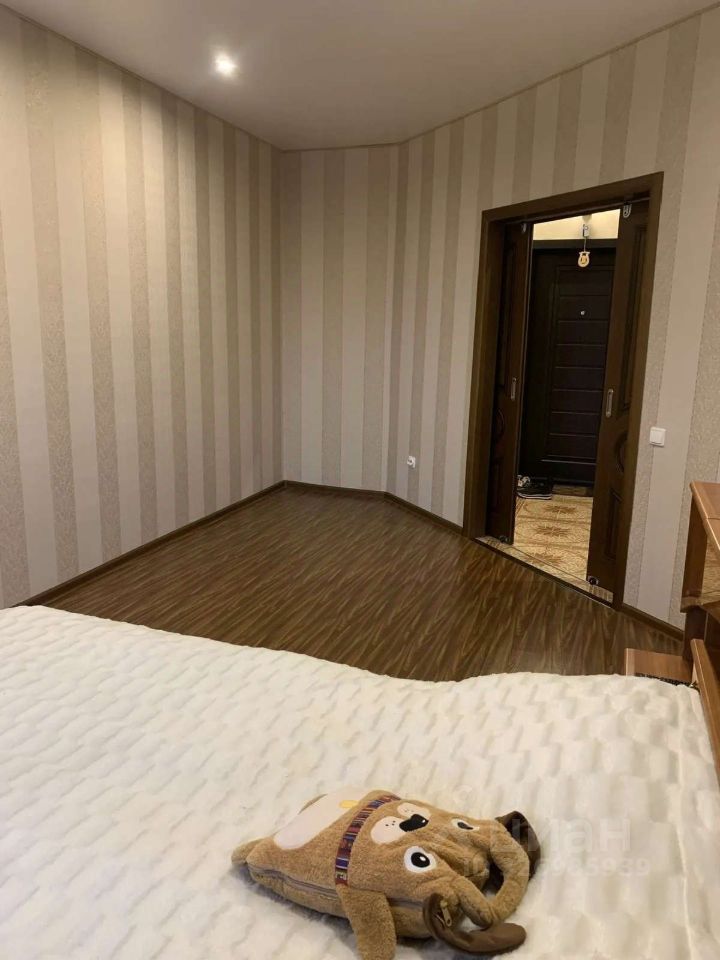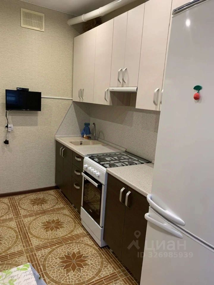 Внутри сделан косметический ремонт, состояние аккуратное. Комната просторная, есть выход на застекленный балкон — окна выходят на улицу. На кухне встроенная мебель, газовая плита. Санузел совмещенный, сантехника современная, стиральная машина в наличии.