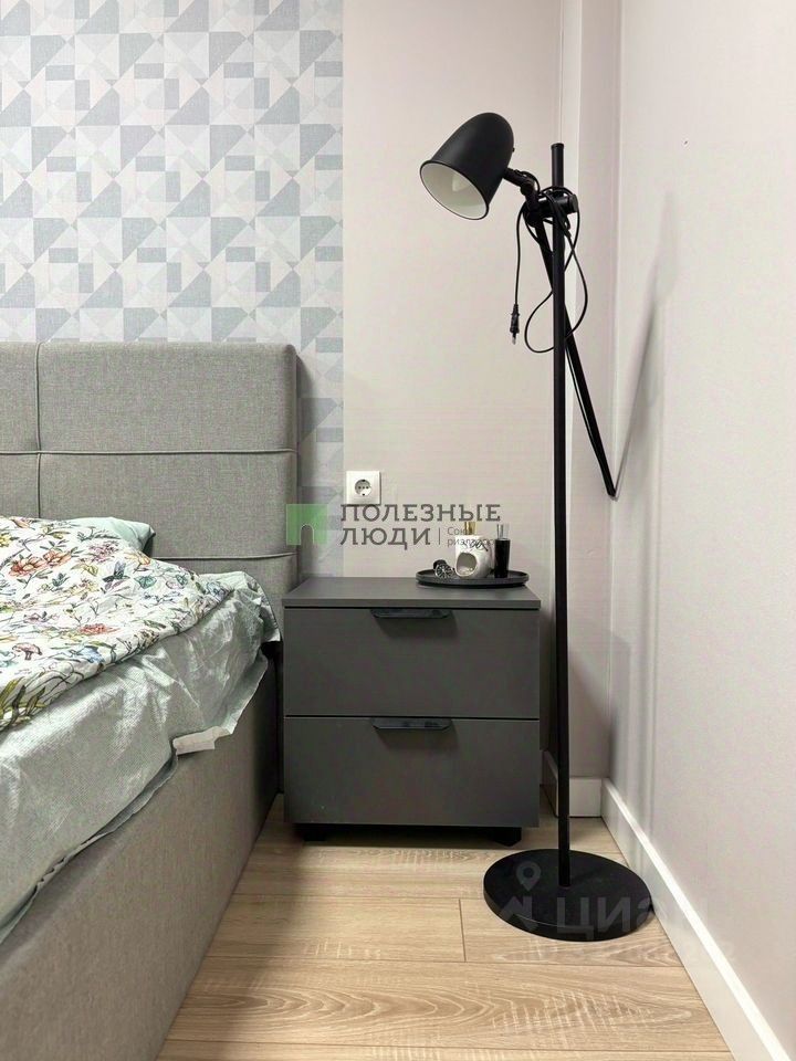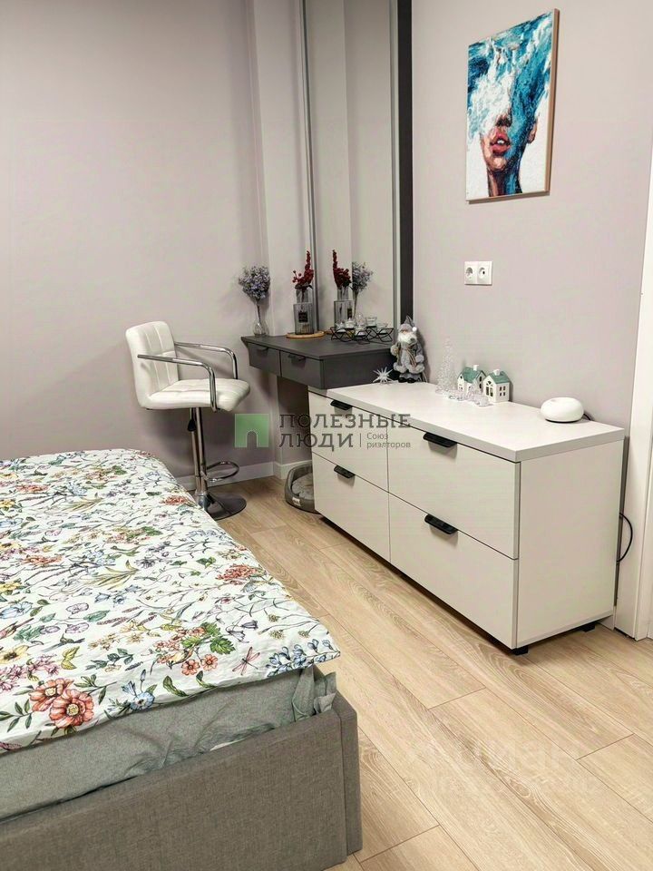 В спальне индивидуально изготовленная мебель - огромное зеркало до потолка, с подсветкой, со столиком , 2 комодами и 2 прикроватными тумбочками в одном стиле. Удобная кровать 160/200 с ортопедическим матрасом и подьемным механизмом ! Шикарные темно-серые тяжелые шторы блекаут.